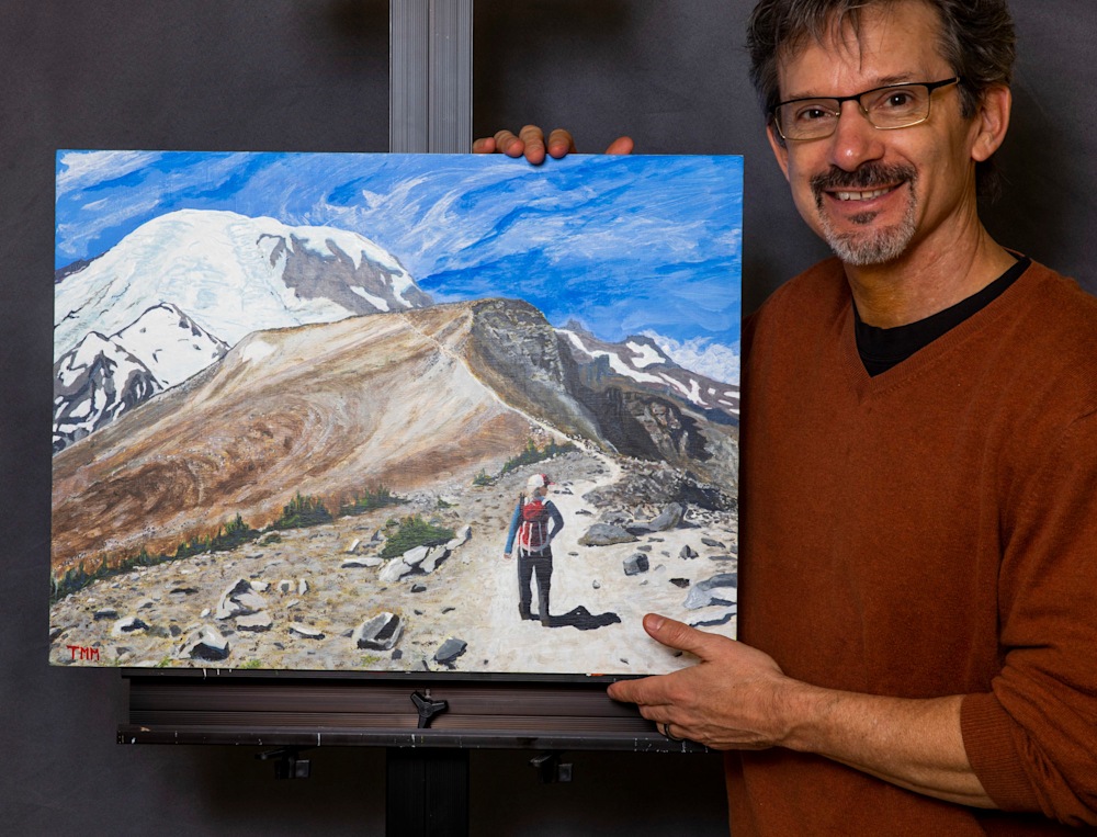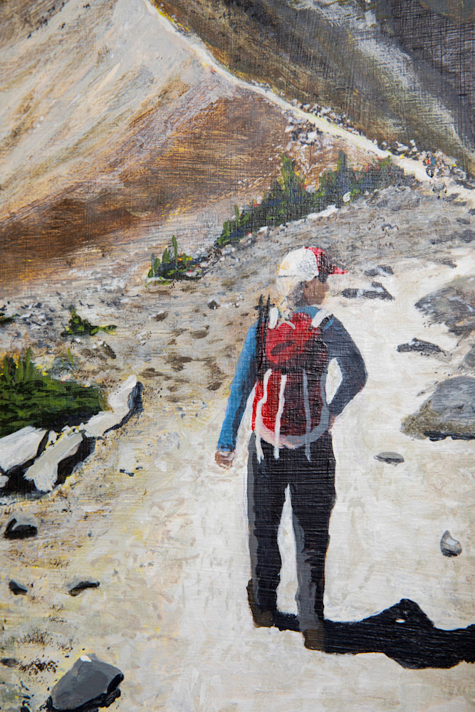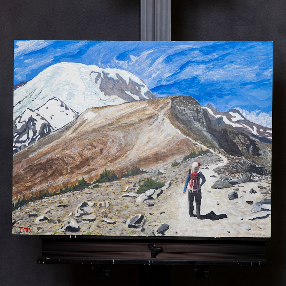 One of my favorite hikes in Mount Rainier National Parks is Burroughs Mountain. This was inspired by my wife hiking in front of me on 1st Burroughs summit headed for the next shelf of the three Burroughs summits. Acrylic on Canvas.