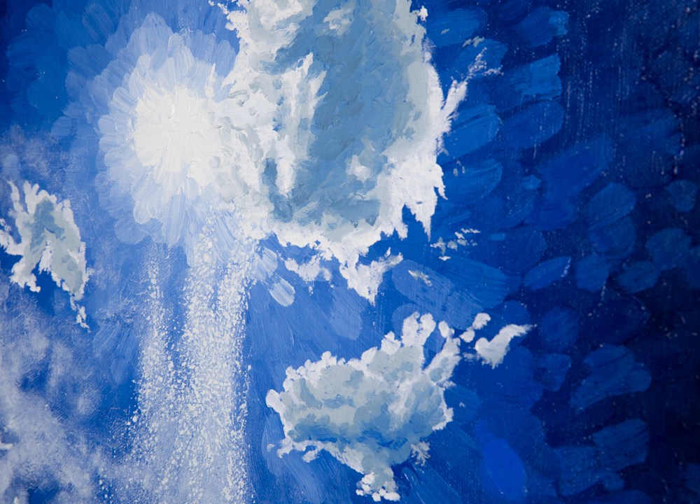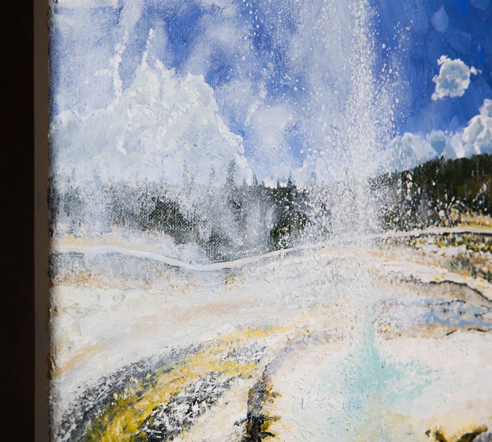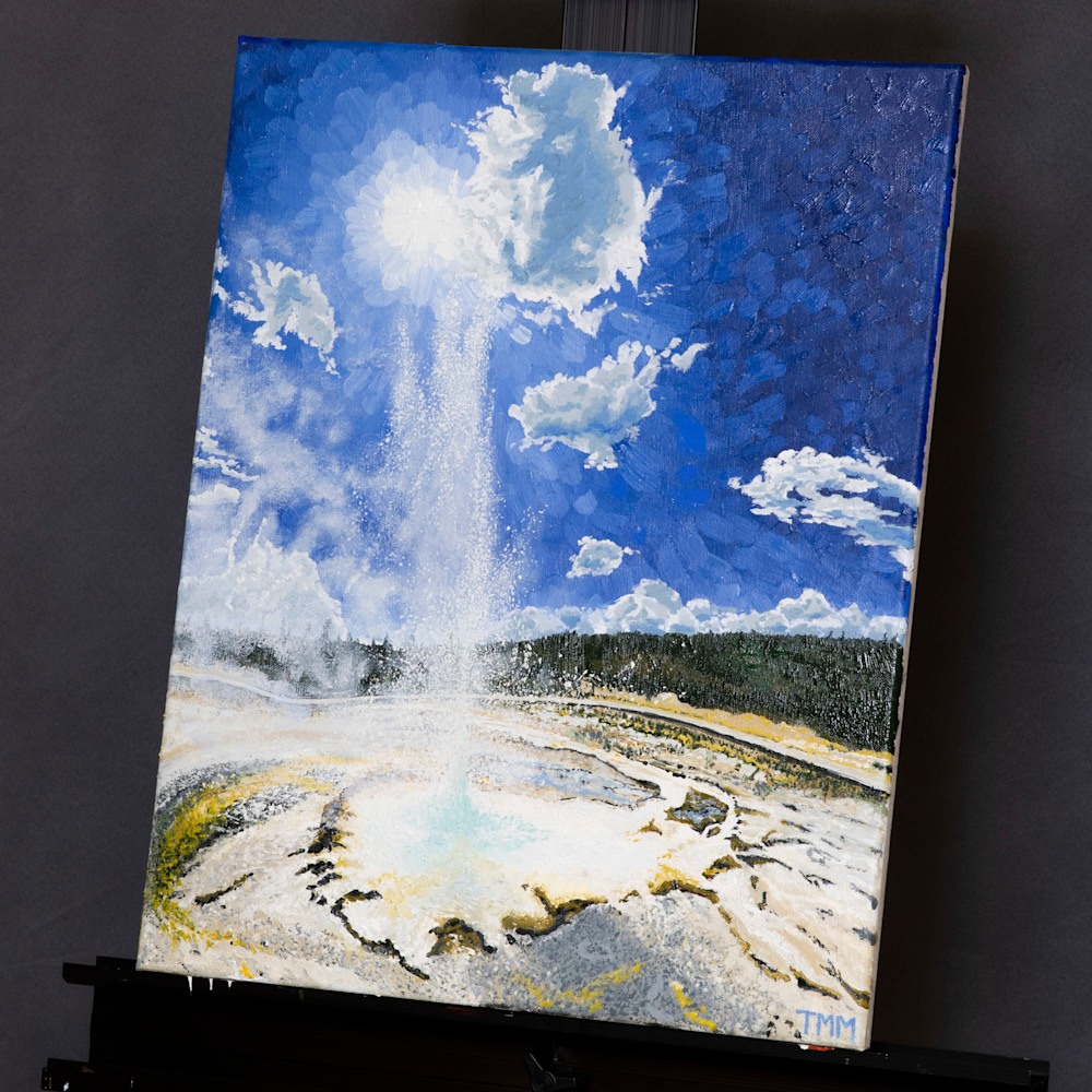 Yellowstone National Park is such a unique place in the world. This Sawmill Geyser just kept on erupting and sputtering and gasping for so long as I walked the boardwalks. It was like a machine gun and with the puffy clouds, blue sky, and the sun beaming down I just had to capture the unique beauty in this painting. I can hear the sputtering and the wind and the sun on my face as I look at this.